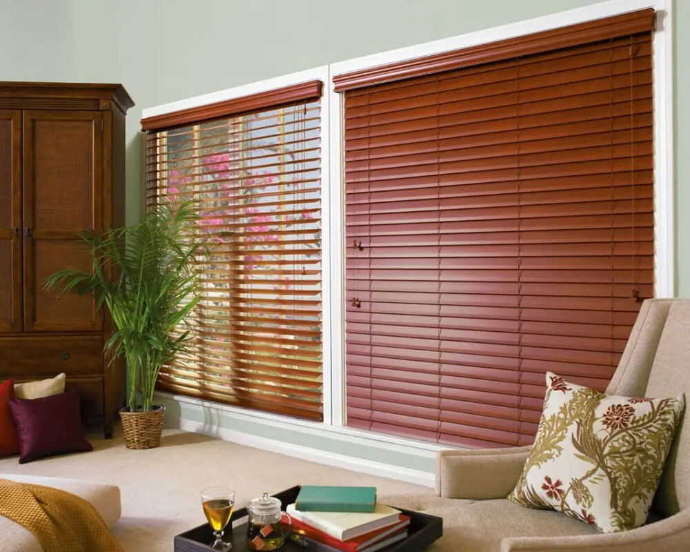- Горизонтальные деревянные жалюзи на окна. Самый распространенный тип, где ламели располагаются горизонтально. Их можно поднимать, опуская или поворачивая, чтобы регулировать поток света.