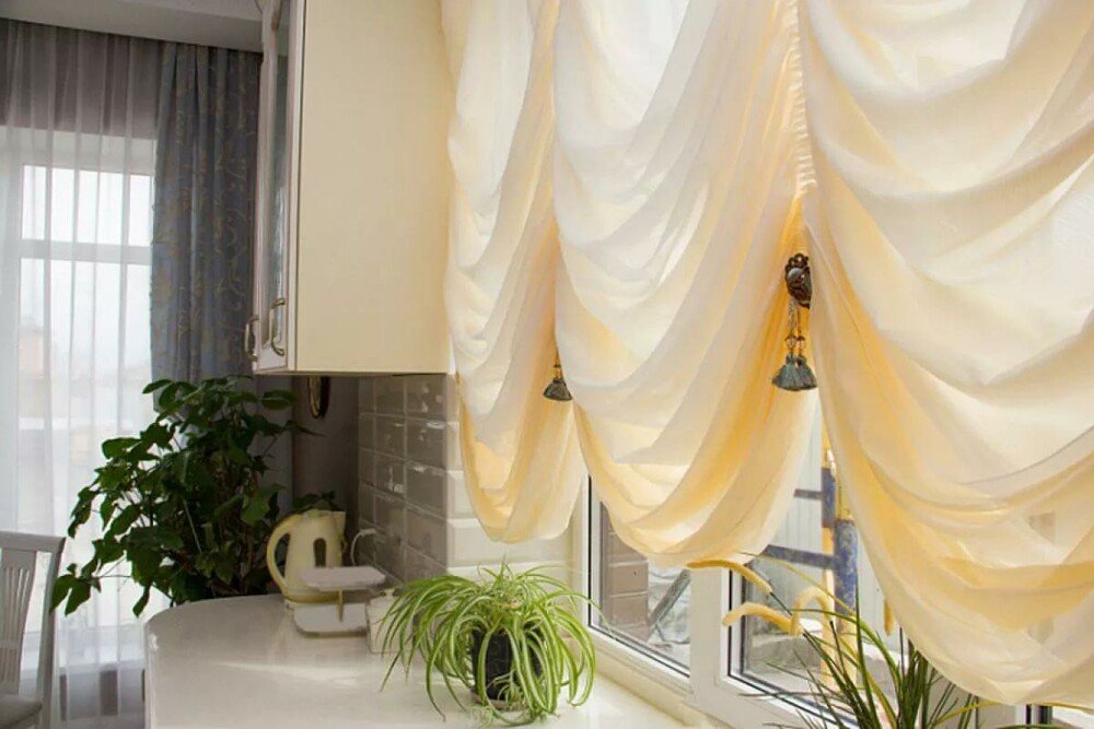 Французская штора тюль шампань, карниз верёвочный