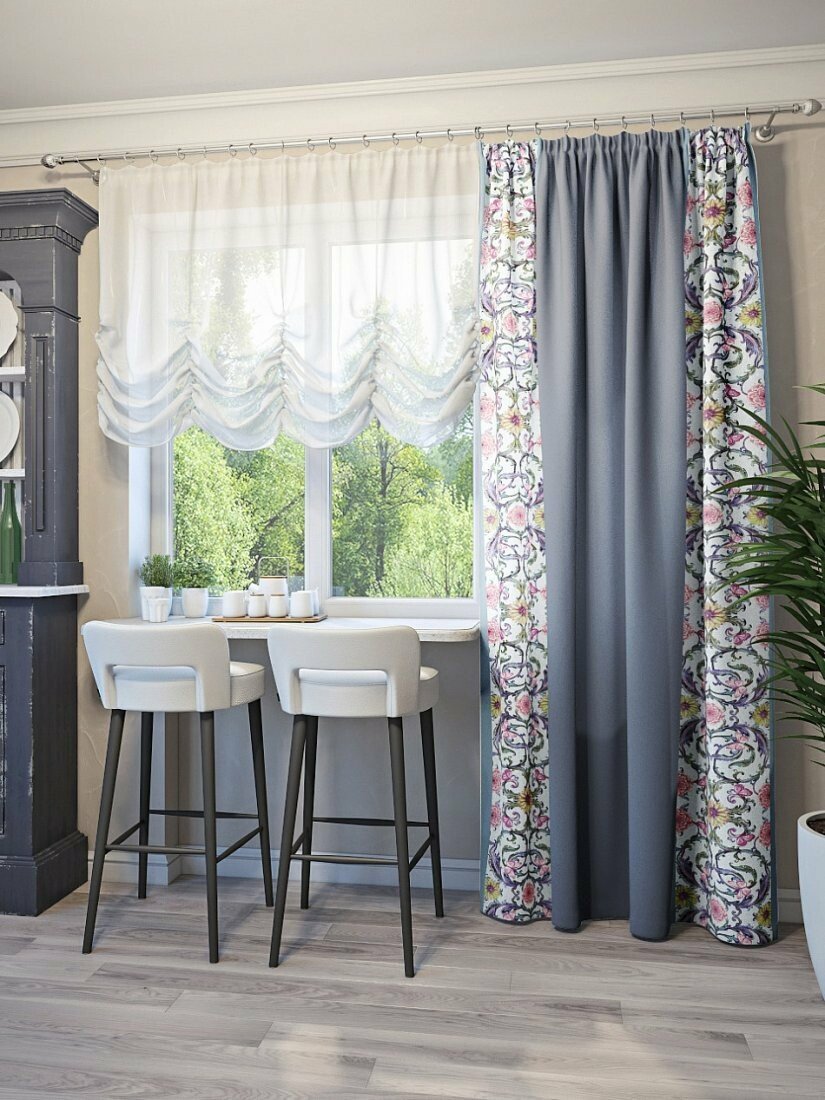 - Для визуального расширения пространства подойдут современные шторы светлых оттенков или с горизонтальным принтом. Для визуального увеличения высоты — с вертикальным рисунком.